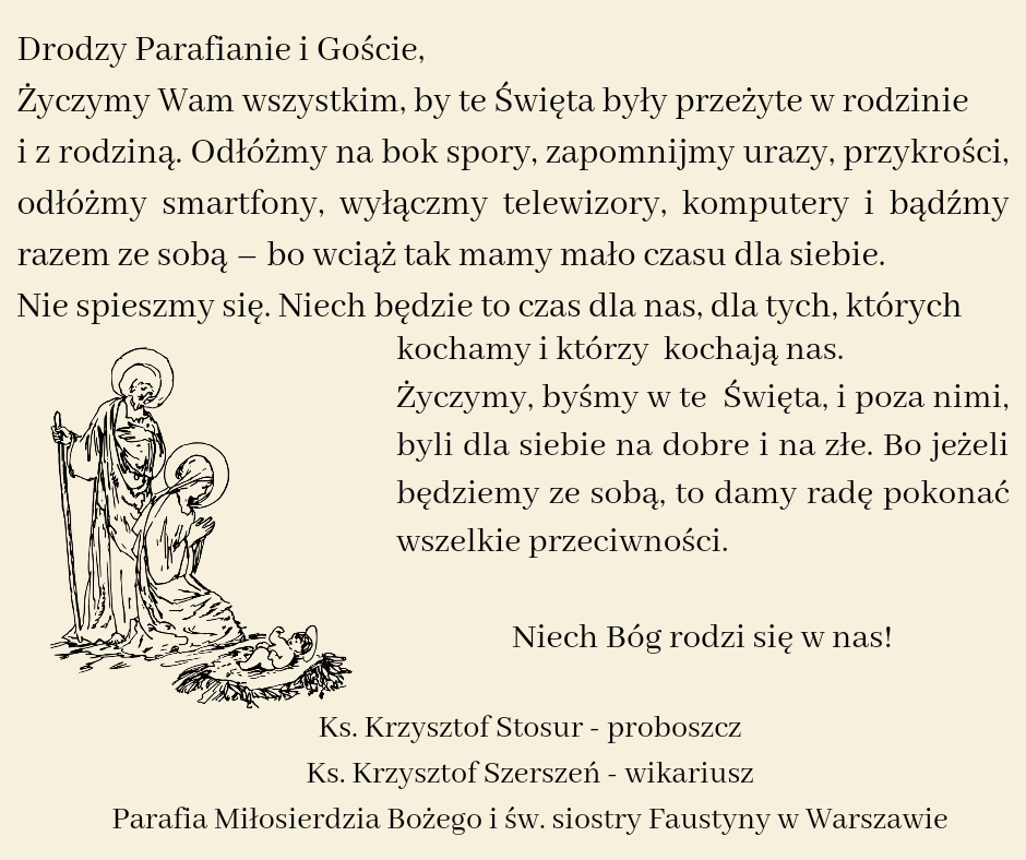 Wizyty rozpoczynamy o godz. 17:00. Prosimy Parafian z wymienianych bloków o wywieszenie w swoich blokach kartek informujących o planowanej dacie wizyty. Kartki dostępne będą w zakrystii.
