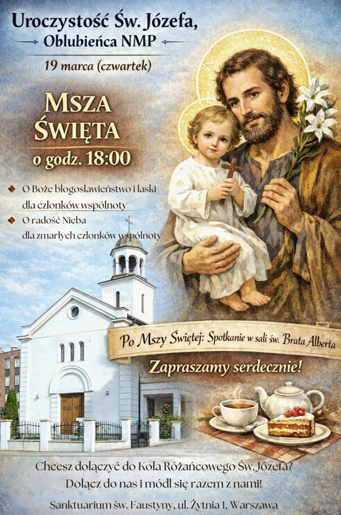 W najbliższy czwartek, 19 marca, przypada Uroczystość św. Józefa Oblubieńca NMP. To szczególny dzień dla naszej parafialnej Wspólnoty Koła Różańcowego św. Józefa! 🌹Zapraszamy wszystkich Parafian, a w sposób szczególny członków Koła oraz ich rodziny, na Mszę św. o godzinie 18:00.Będziemy modlić się wspólnie:
